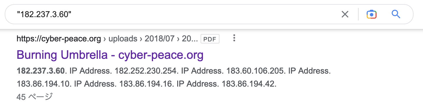 そのままIPアドレスググったら何かのレポートが出てきました! Burning UmbrellaというWinnti Umbrellaと呼ばれている攻撃に関するレポート中で先ほどのIPアドレスがIOC情報として言及されていました。つまり、攻撃に使われていた・・・?
