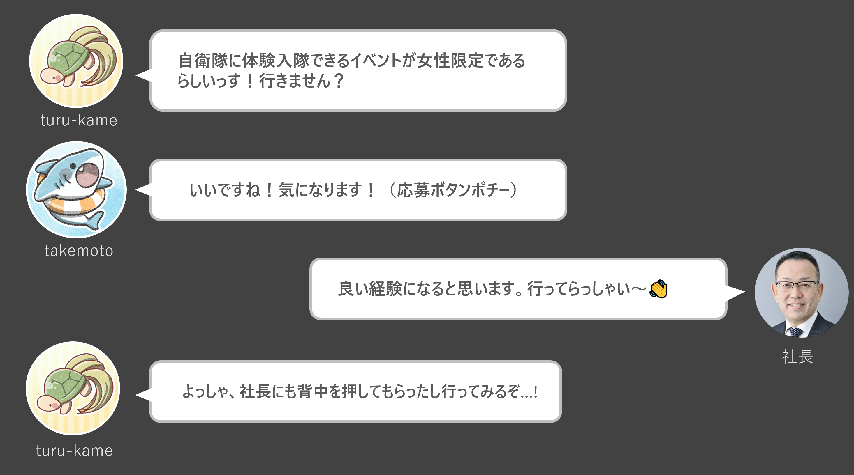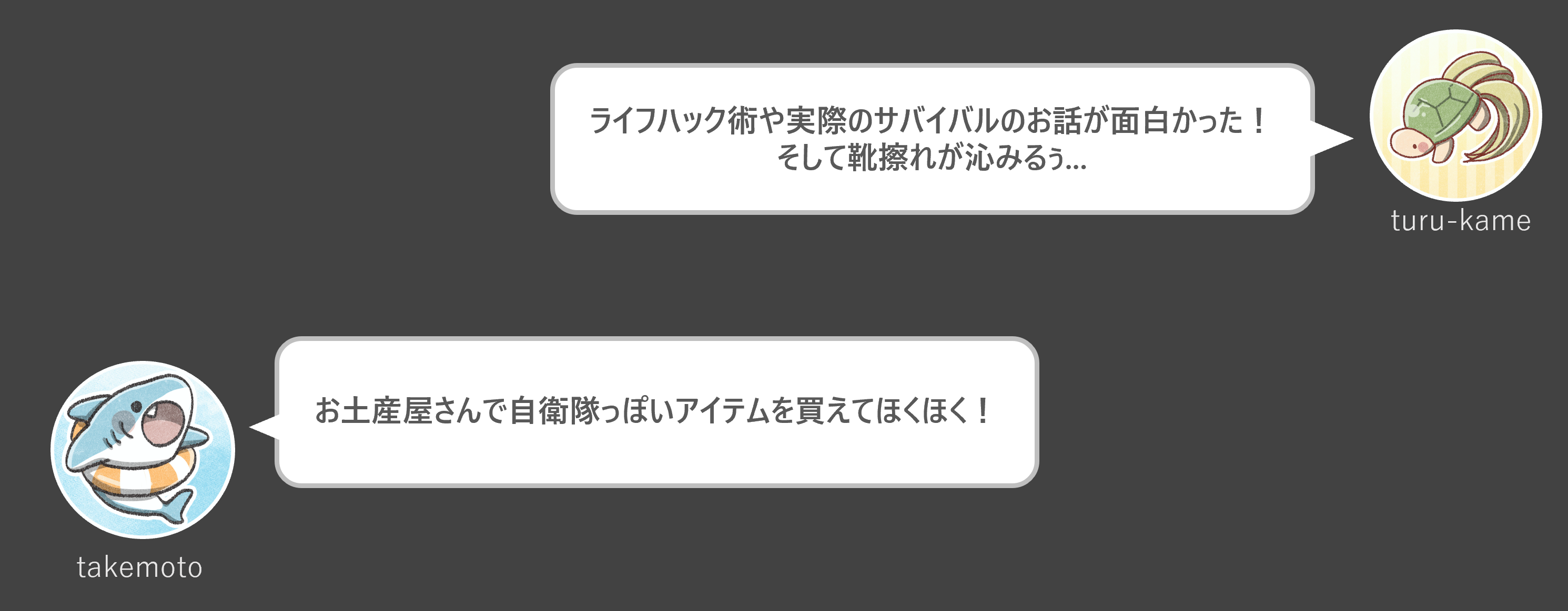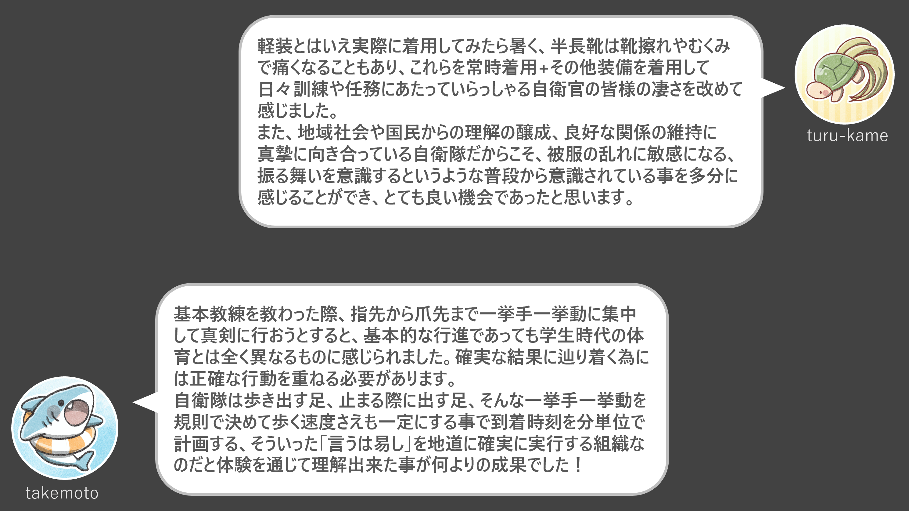 - なぜ参加したか:セミナーなどの参加者の中に防衛省や自衛隊のかたがいらっしゃるので、お客様理解に繋がるかと思ったため。本音は一時期進路として希望していたこともあり、これ幸いと参加申し込みをした