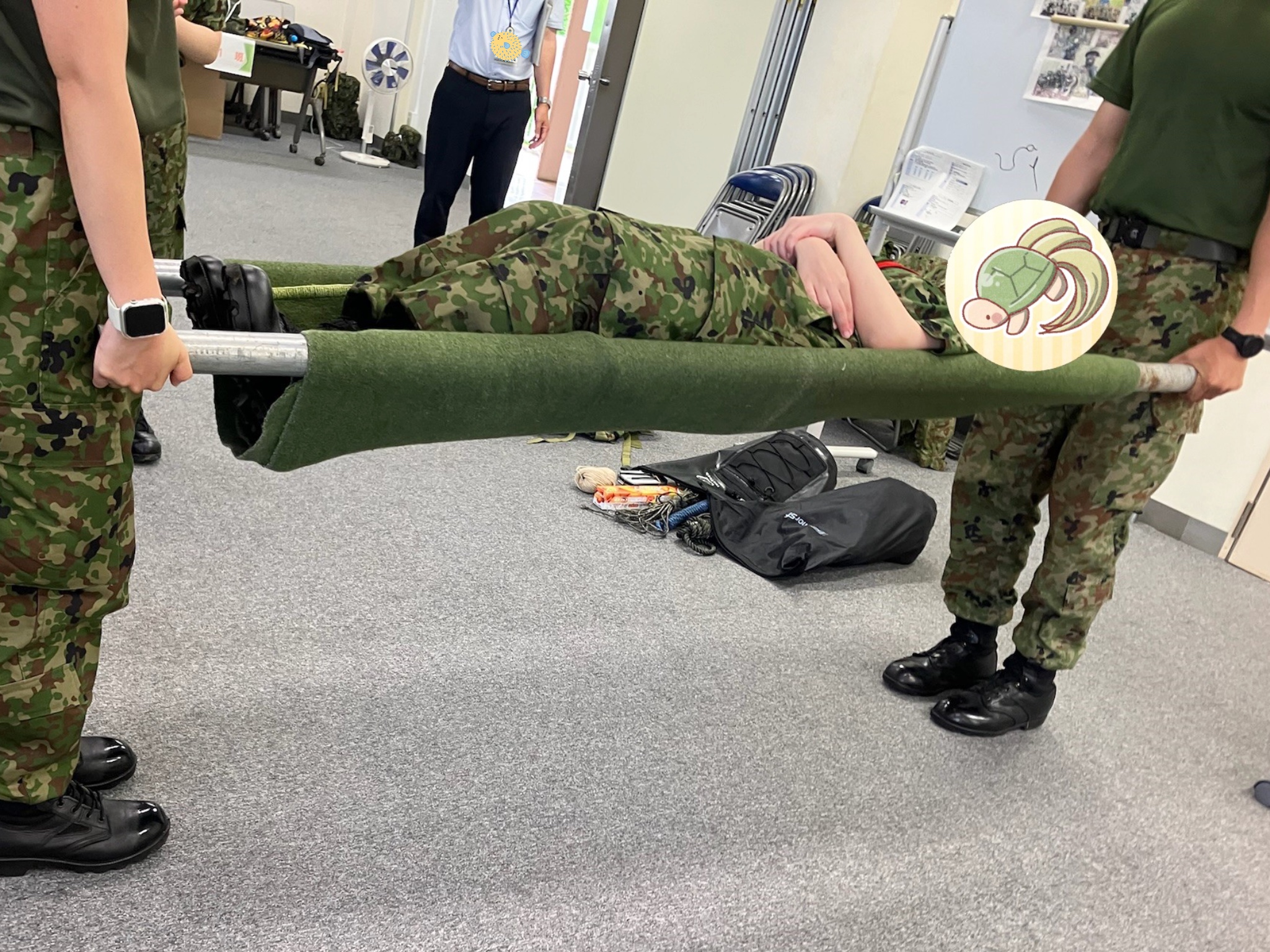 担架搬送訓練では、実際に自衛隊で使用される担架に成人男性の体格・体重をした人形を乗せて搬送を体験した。