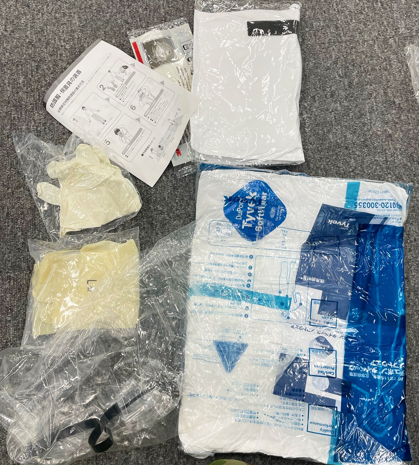 写真では少しわかりづらいが、防護服、大きめのゴム手袋、小さめのゴム手袋、ゴーグル、N95マスク、靴のカバーが1つのセットとして封入されていた。