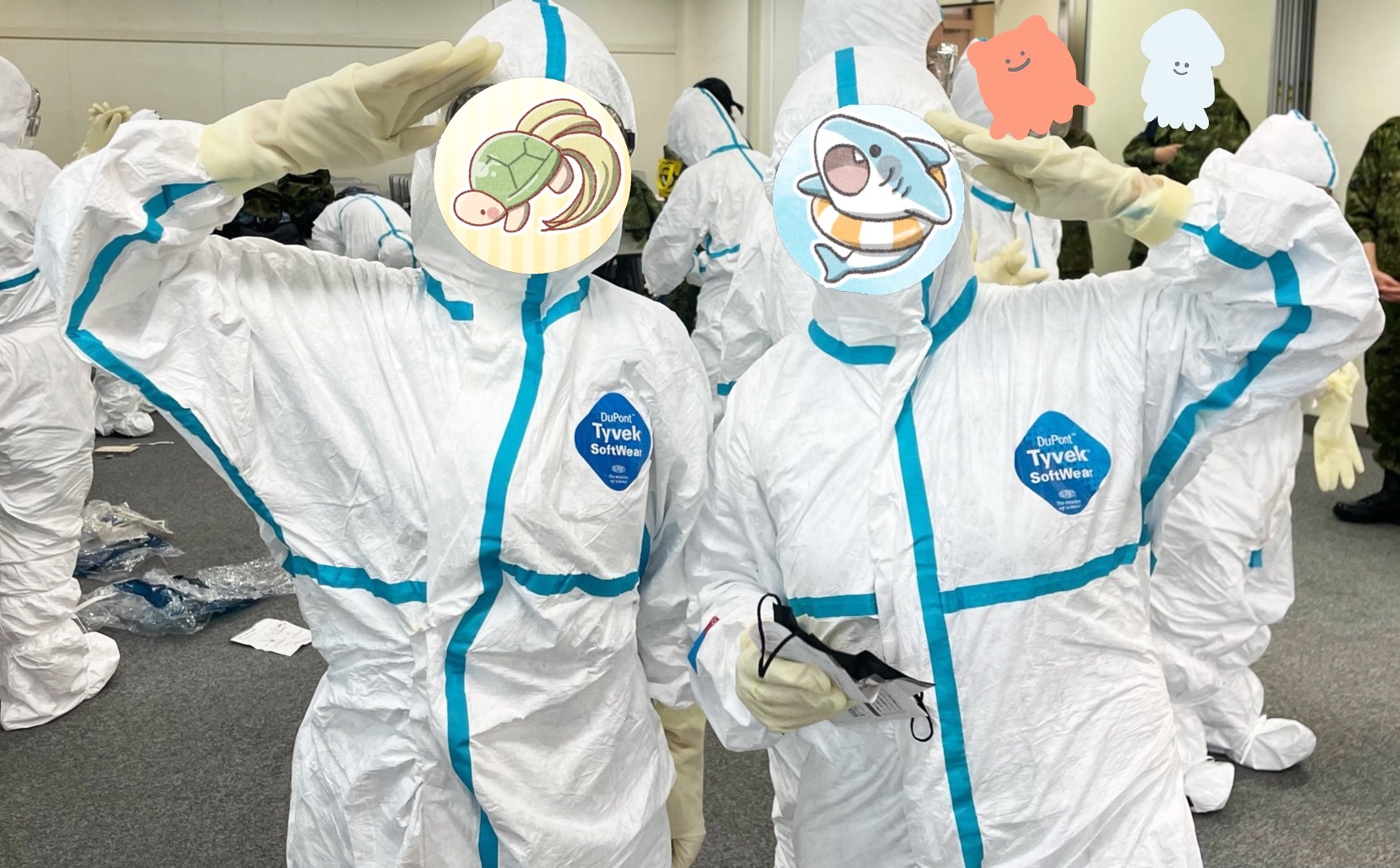続いて個人防護服の試着を行った。この防護服は昨今の鳥インフルエンザや新型コロナウイルス感染症など感染症が発生している場所で任務にあたる際に着用するものである。