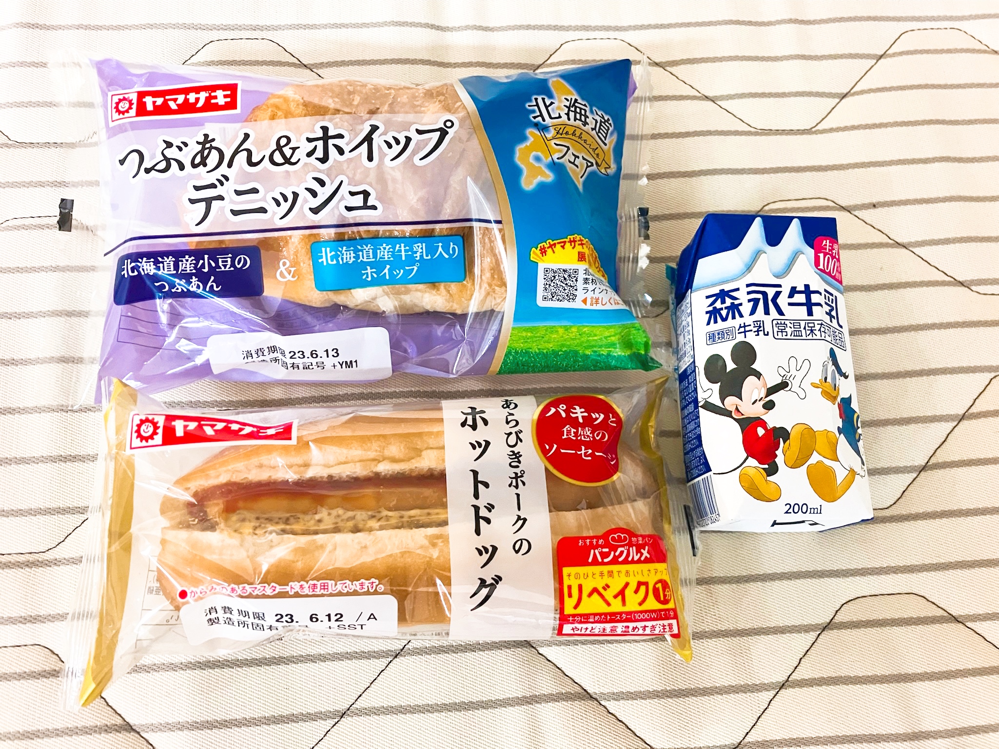 パン2個と牛乳1本。自衛隊はよく牛乳を飲むのだなという感想を抱いた。ディズニーの柄がかわいらしかった。