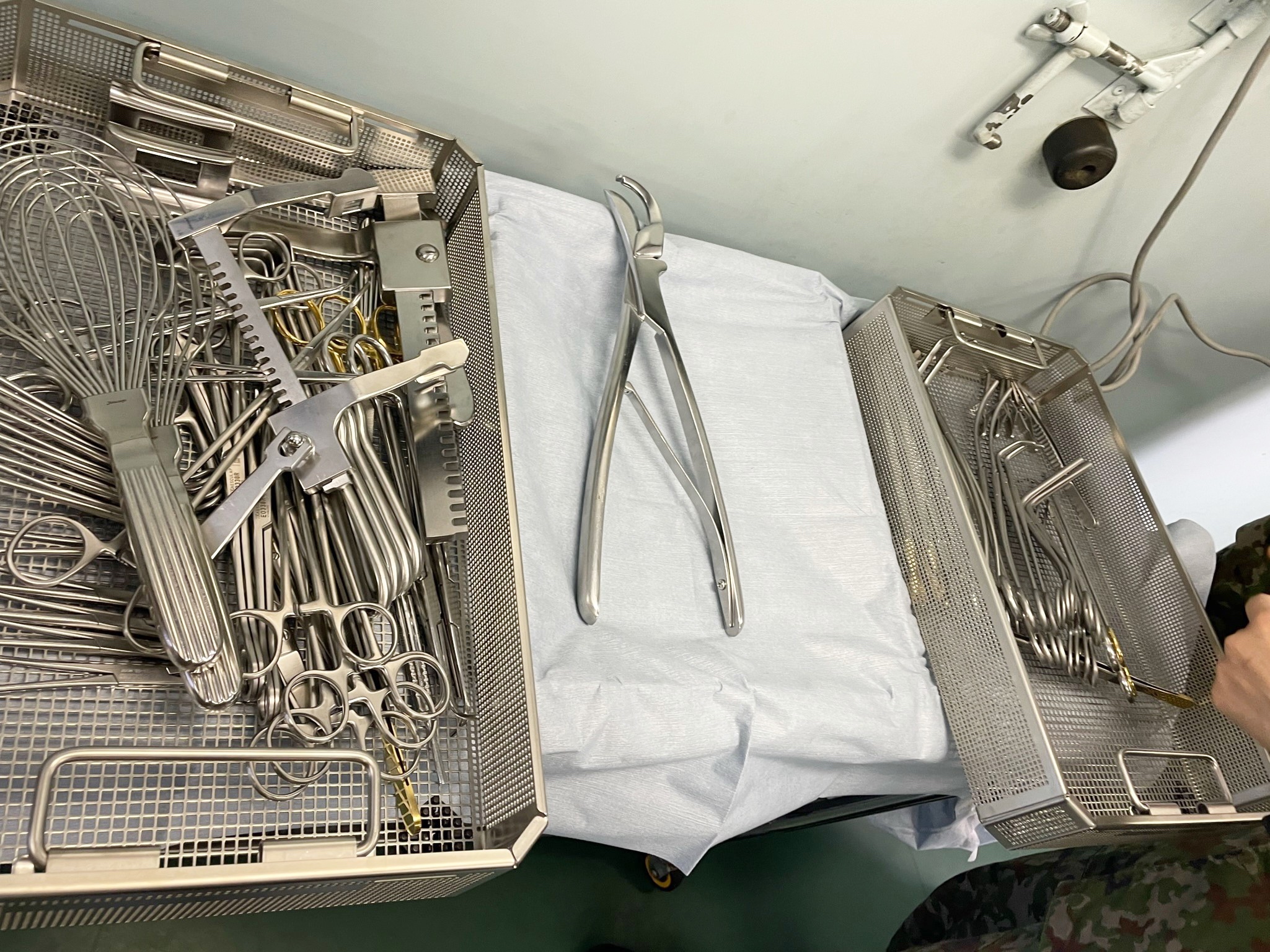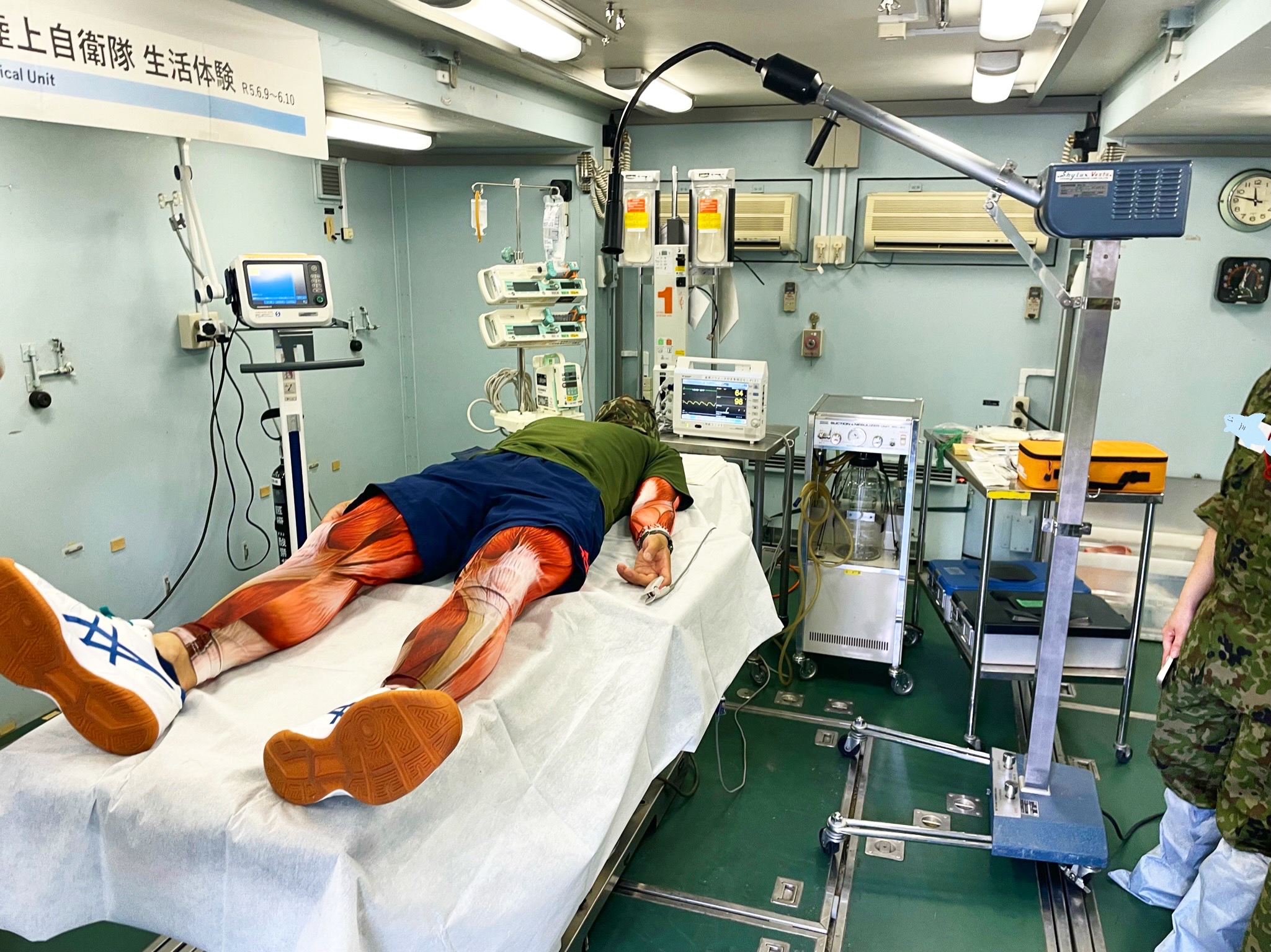 レントゲンの撮影ができるほか、空から見つからないようにするために屋内を最小限の照明に切り替えることができるそうだ。実際に暗くして赤い電球だけが点灯している状態を見せてもらったが、突然音楽が流れてディスコと化した。サビに差し掛かったところで筋肉スーツを着た隊員のかたが飛び起きて、茶目っ気あるなぁーっと思いつつ、驚きすぎて若干涙目になったことはここだけの秘密だ。