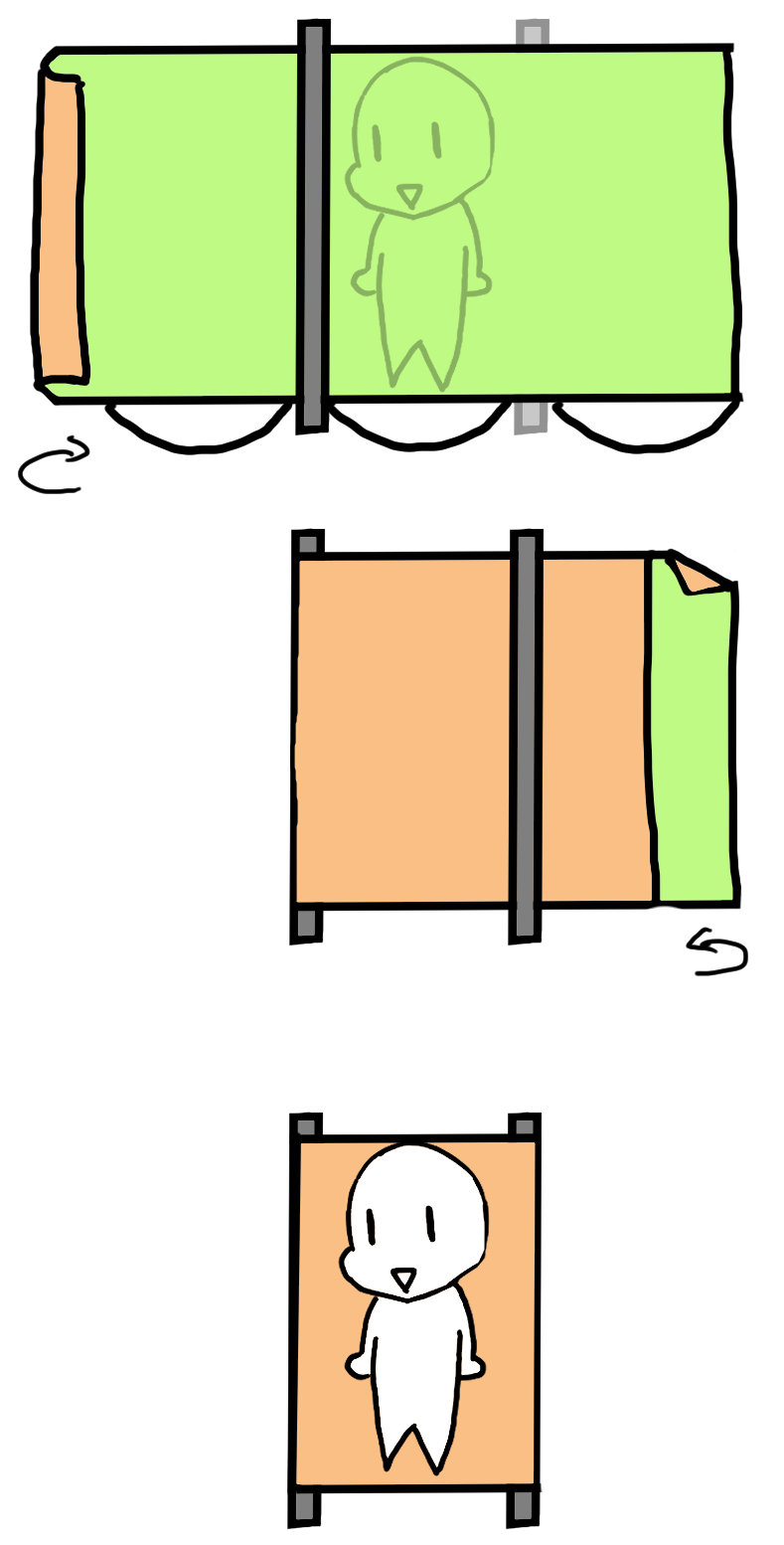 まず2mほどの棒を布の1/3+aの位置におき、1/3+aの布を折り曲げる。続いて棒を1/3の位置に置き、余った布を折り曲げる。なんとこれだけで担架は完成する。この時1つコツがあり、最初に折り曲げる布は全体の1/3より長くすることだ。これにより、もう一本の棒に対する摩擦が増え、人が乗ってもずり落ちにくくなるそうだ。