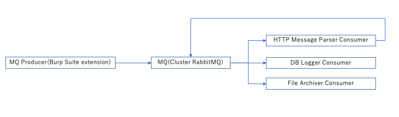 MQ(Cluster RabbitMQ) ----> MQ Consumers(HTTP Message Parser Consumer,DB Logger Consumer,File Archiver Consumer )の動作は複数ありまして全体共通は