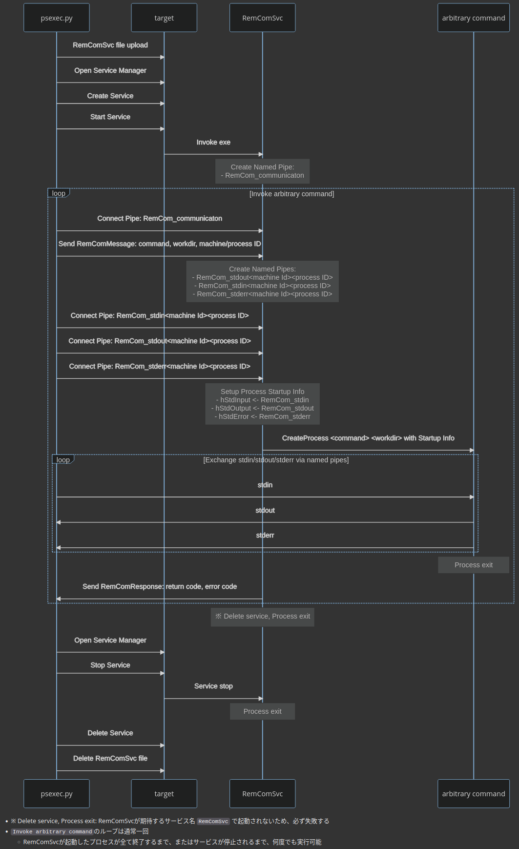 開発時に社内説明用に psexec.py(RemComSvc 同梱)の動作シーケンスを図解したものがあったので、本稿にも掲載しておきます。