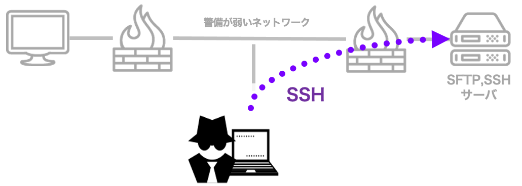 何かが足りないSFTPクライアントが、Firewallと物理警備の弱いネットワークを介してSFTPサーバとパスワード認証でSFTP通信をしていたとします。 物理警備の弱いネットワークを発見した攻撃者が、攻撃端末を設置し、SFTPクライアントからのSFTP通信を攻撃端末上の偽装SFTPサーバで受信する中間者攻撃を仕掛けたとします。