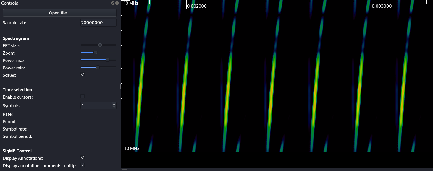 以下にのこぎり波の例と実測したジャミング波のスペクトログラムを示します。よく似ていますね。