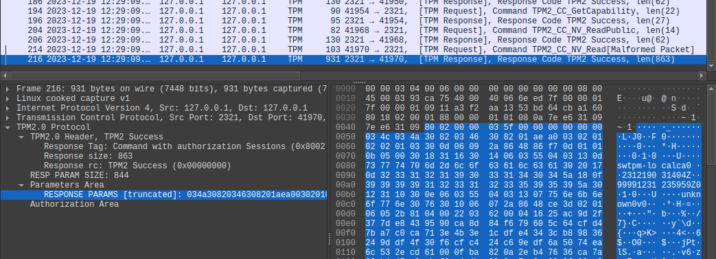 106 2.823490764 127.0.0.1 ? 127.0.0.1 TPM 1169 2321 ? 57066, [TPM Response], Response Code TPM2 Success[Malformed Packet]