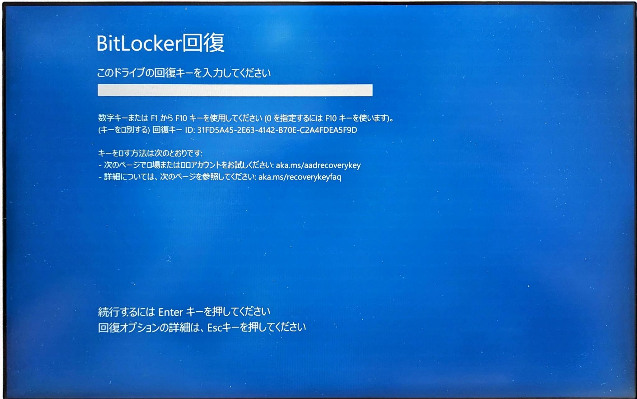 実機で実施した場合に回復キーがない場合には、保存されたデータへアクセスできなくなってしまうので、回復キーのバックアップはしっかりと取っておきましょう