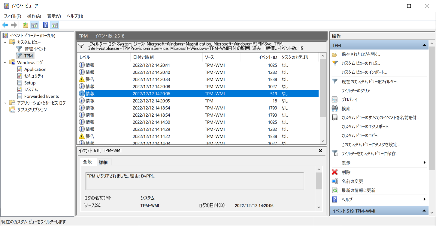イベントビューアを見てみるとTPMがクリアとのログは残っていますが、今回実施した端末では操作後も回復キーを求められることなくディスクが復号されることを確認しました