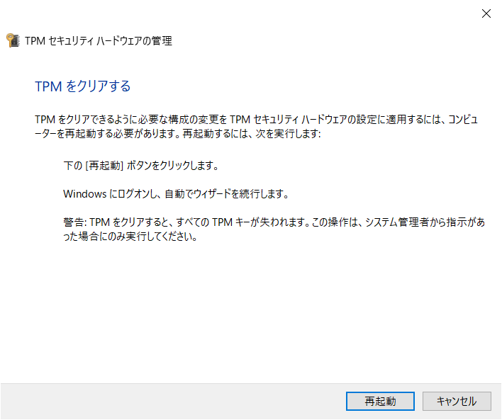 もしかしてTPMを初期化するというのは容易に実行し得るのかも知れない、 そう思いそのまま進んでみると
