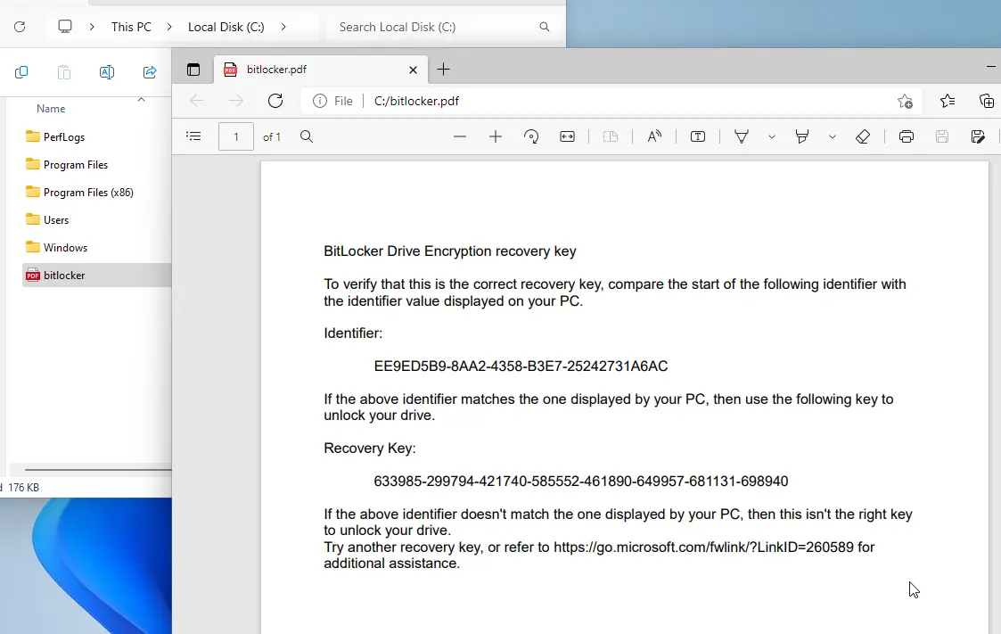 BitLocker 回復キーの方は先程 PDF で見たのと同じ ID ですね。